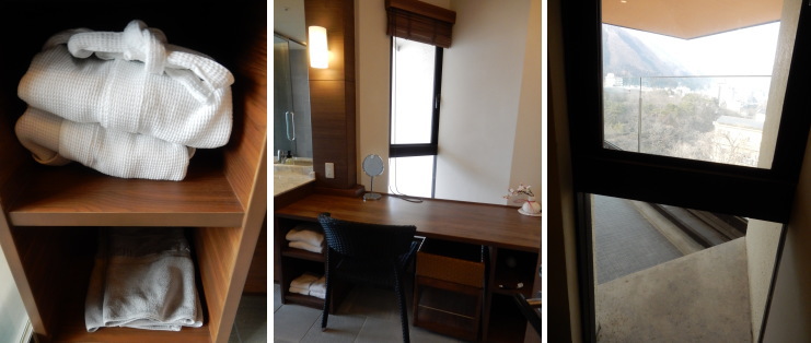 | バスローブもあります。テーブルの前の三角スペースにも窓があって、とにかく明るくて気持ちがいい♪ |