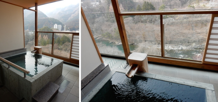 | 目隠しの障子は開けることができるので、景色を楽しみながら入れます。 |