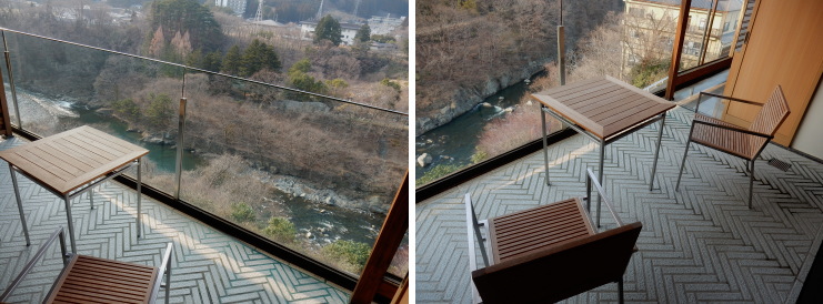 | くの字に曲がった建物なので、反対側の客室のテラスが良く見えました。川の眺めは向こう側の客室からの方が良さそう。 |