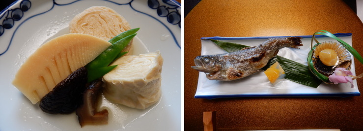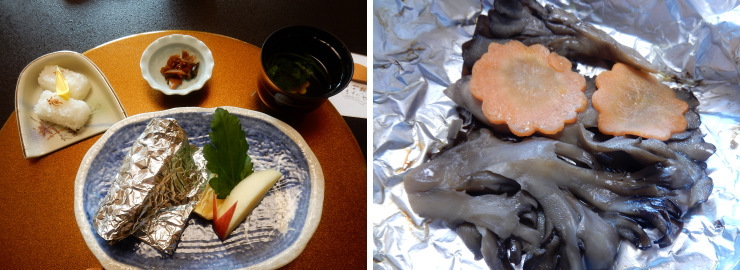 | 揚げゆばの煮物。美味しーい!鱒の塩焼きも熱々で美味しい。 |