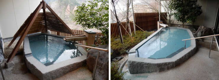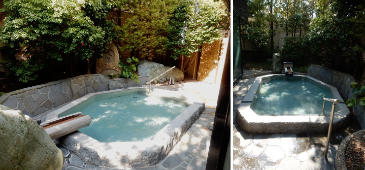 | 内湯は先客が居たので明るい時間の写真は撮れませんでしたが、脱衣所を挟んで2ヶ所ありました。露天風呂はガゼボを挟んで左右に大小2つ。白御影石の一枚岩で造られています。 |