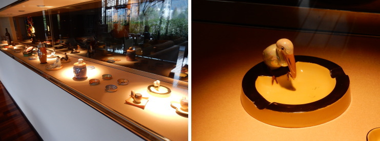 | ラウンジの背後ジョンには金谷カナヤのコレクションが収められたギャラリースペース。オールドノリタケの灰皿が可愛い♪ |
