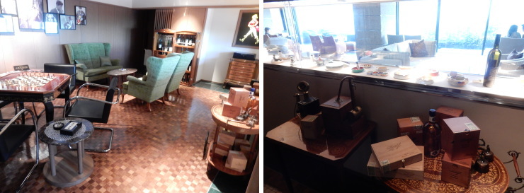 | アンティークのゲームテーブルや洋雑誌、薄暗いライティングがダンディーな雰囲気を醸し出していました。ちなみにシガーは1本1000円から。 |
