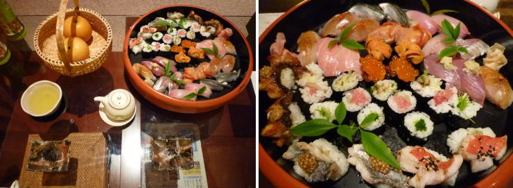 | ラ・松廬は夕食が付いていないので、外食するかルームサービスをとるかになります。本館の個室料亭「よしだや」や「きゅいじーぬ四季彩」で食べるのがスタンダードのようですが、メニューを見る限り「なんだかな〜」な感じだったので、宿お薦めの近所のお寿司やさんで出前をとることにしました。 「鮨 笹元」というお店で、メニューは無いそうなので2人前1万円で注文。(出前といっても、バトラーが注文し、受取り&セッティングしてくれますし、料金もチェックアウト時に宿泊料金と一緒に支払うので、ルームサービスと同じ感覚です。) 届いてびっくり!まー美味しい!!こんな美味しいお寿司が出前で食べれるなんてー(*´Д`*) |