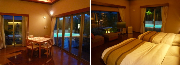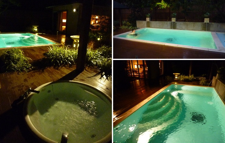 | プールとジャグジーは水着着用です。気になる外からの視線ですが、ヴィラの左側と左前方には本館があります。しかし左側の建物の窓は曇りガラス、左前方は松林が生い茂っていたので気になりませんでした。 |