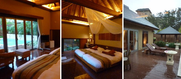 | 広〜いテラスには横幅5mもあるプライベートプールと専用ジャグジー。プールは基本的に3月下旬から11月下旬までの気温が低い時期は28℃〜30℃に加温されているそうです。しかし、一番寒い12月〜3月は加温なしとのこと。この広いプールを目の前にして入れないとなると、よっぽど値下げでもしてくれない限り宿泊するのはもったいないなぁ〜 |