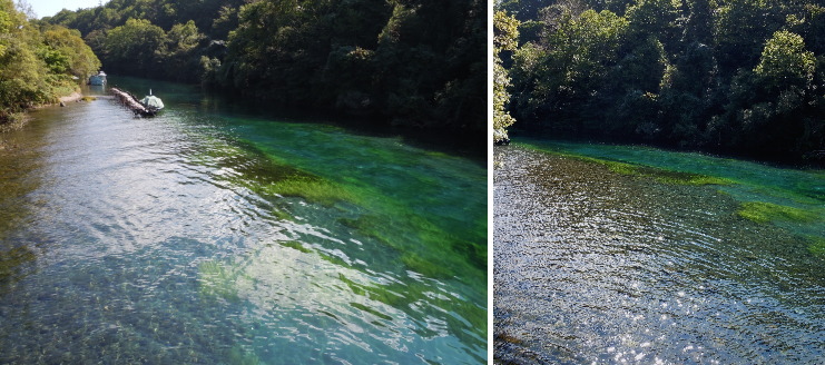 | 鉄橋から見た千歳川。千歳川は支笏湖へと続いている清流です。水草によって生まれる緑のグラデーションが美しい。 |