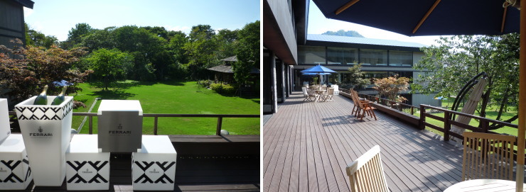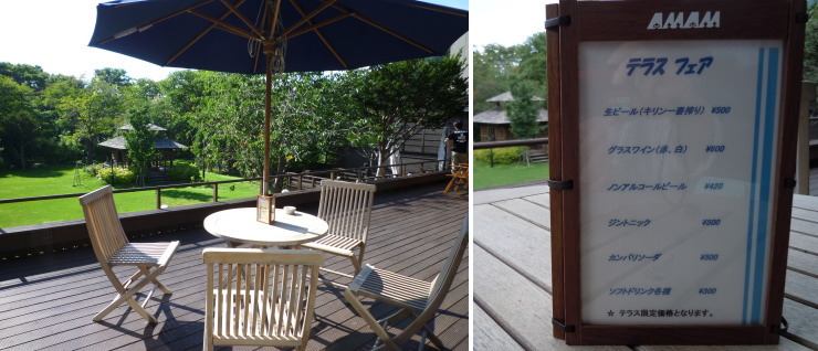 | ウッドデッキテラス「水の謌テラス」。オープンエアのカフェです。中庭を望む絶好のロケーション。各種ドリンクの他、パティシエ・ラボのケーキもここで食べることが出来ます。 |