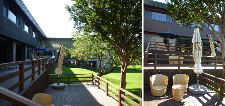 | 中庭側から見た写真。正面のテラス上が和食レストラン、右側がビュッフェレストラン、左側に少し見えている建物が私達が泊まったプレジデンシャルスイートのある棟です。 |