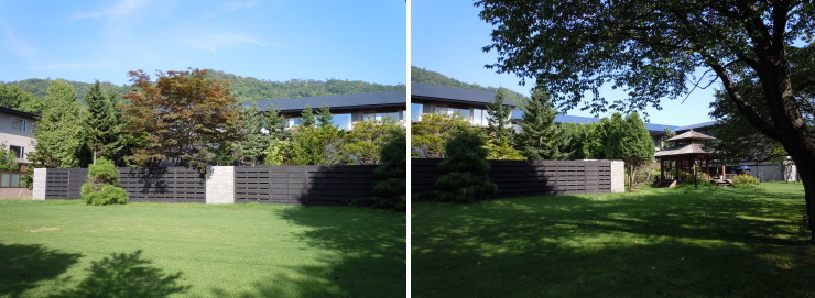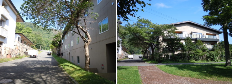 | 場所は変わって、こちらは支笏湖側から見てホテルの左端。道路を挟んですぐ隣に「翠山亭」が。この道沿いのお部屋は眺望は全く望めないようです。 |
