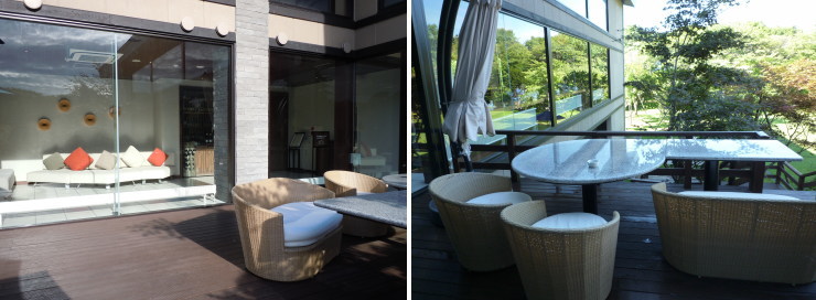 | 左側の棟、1階の「スパガーデンスイート」は客室の庭から直接外に出られるようになっているようです。右下の写真は庭から私達の客室をズームしたもの。窓際に居た夫が見えました。やはりお風呂のテラスも見えるので、特に夜は要注意ですね〜^^; |
