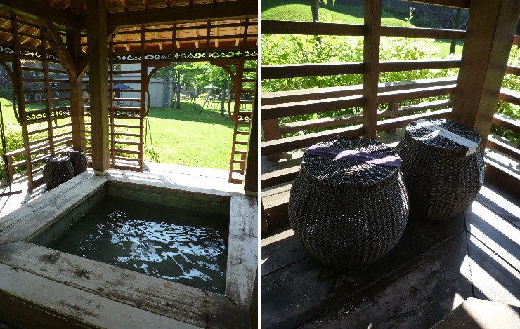 | 宿泊棟の方にも庭があります。中庭には草屋根の足湯も。 |