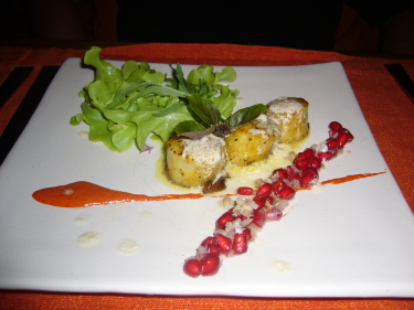| 前菜のホタテのソテーざくろソース。 |