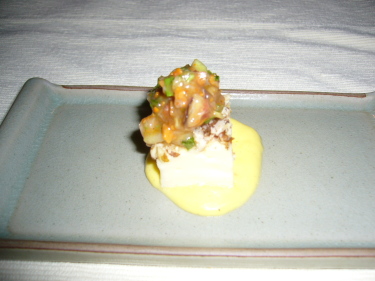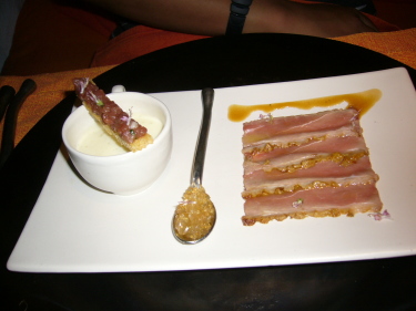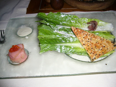 これは彼の前菜。とってもおしゃれで美味しそう。 |