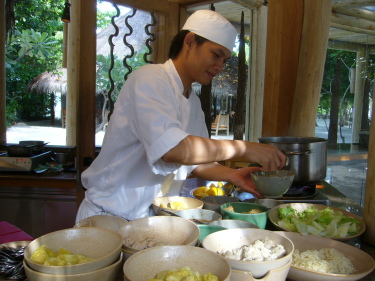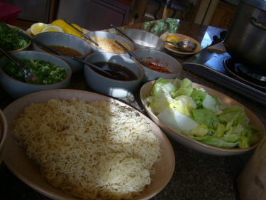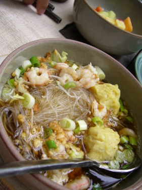 | 先ずエビやワンタン、野菜などのトッピングを選びます。次にスープの味(スパイス・砂糖・酢)をリクエスト。でもシェフにお任せが一番美味しかった!麺が春雨の日もありました。 |