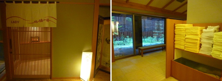 | ●5階天空露天風呂「雲井の湯」15:00-22:00 朝5:00-10:00 手前が男湯、エステの受付を挟んだ奥が女湯の入り口です。女湯はエステのスタッフに挨拶しながら入る感じで、ちょっと何度もは行きづらいですね。そのせいか5階のお風呂は不人気で、いつ行っても貸しきり状態で入ることができました。 |