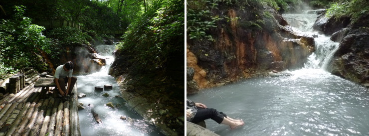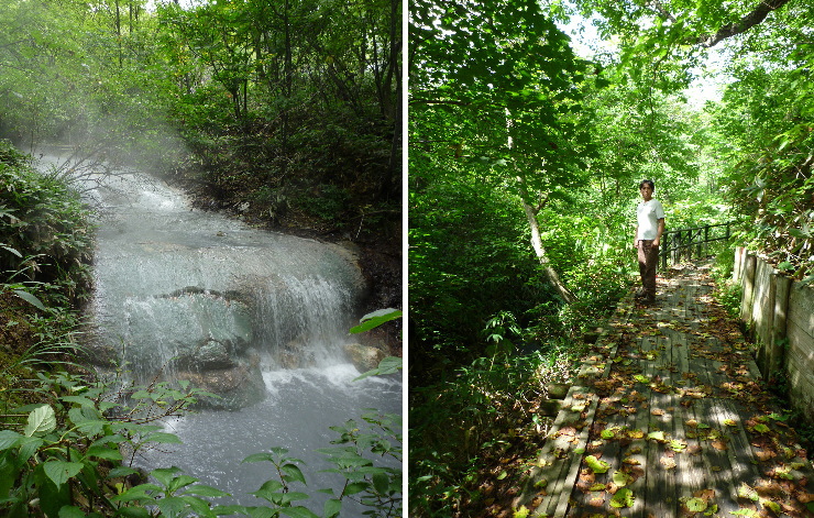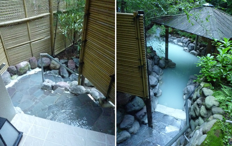 | 露天風呂は更に下に下りていきます。階段にもお湯が流れていて足元が温かいです。奥の方に入って行くと何やら足先に当たる物体が(多分、落ちた枝や葉)。その瞬間“カエル風呂の恐怖 by 二期倶楽部”がよみがえり、体が硬直!(ほとんどトラウマ^^;)。体を沈めるのが恐ろしくなって、そのまま退散致しました(;´Д`) |