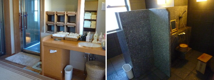| 脱衣所も洗い場もとてもコンパクト。脱衣所の大きな窓から露天風呂が見えるようになっていました。 |