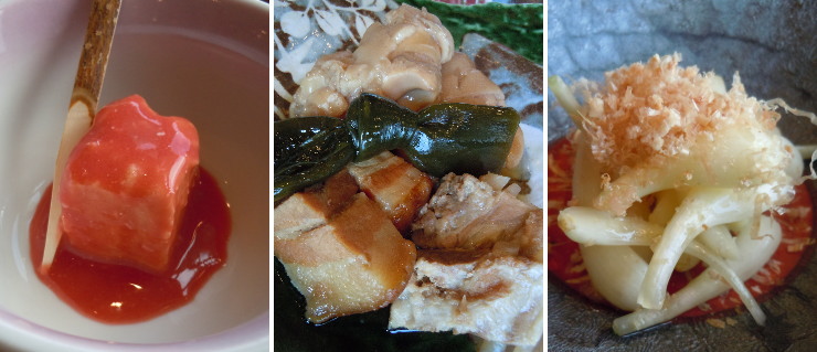 | 「豆腐よう」、「ラフテー・ソーキ・てびち盛り合わせ」、「島らっきょ」。ここぞとばかりにザ・沖縄料理を注文!(笑) |