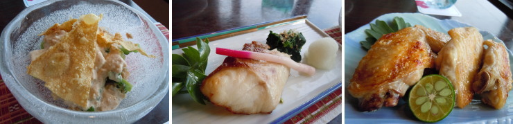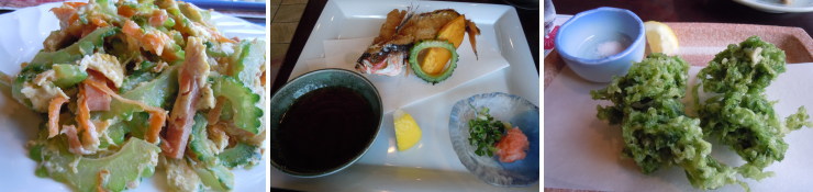| 左から「ゴーヤチャンプル」、「ぐるくん唐揚」、「アーサの天麩羅」。 |