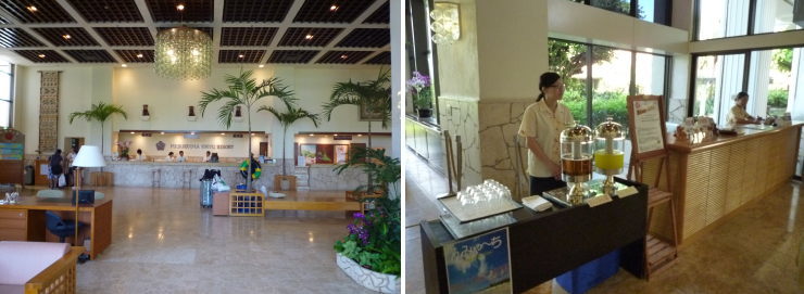| ロビーも広々。ドリンクサービス、アクティビティなどの予約スタッフも常駐してます。 |