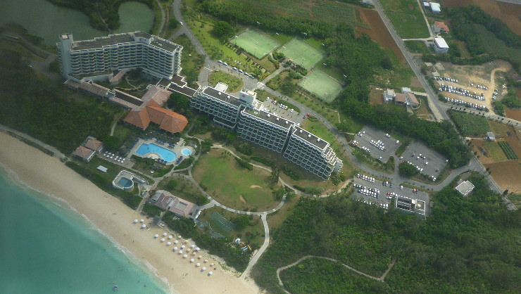 | 上から見た全体図。左側の高い棟が「コーラルウィング」、右側が「オーシャンウィング」です。この写真は、行きの飛行機から撮ることができました。 |