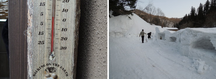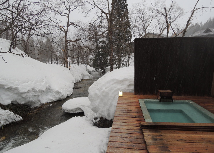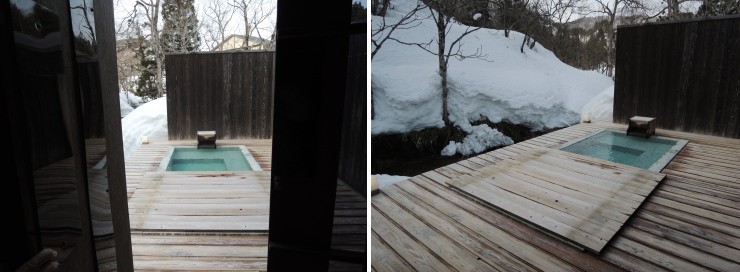 | 豪雪地にあるのはとても魅力的で、かけ流しの温泉は凄く気持ちの良いお湯だったんですが、3万円以上の宿としては何かもうひとつ足りない感じがしました。部屋のソファの快適度、唯一の貸切風呂が30分単位でせわしない、パブリックな施設がなかったからかもしれません。 |