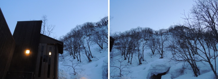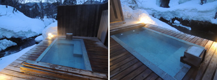 | 15時から22時30分の間に1回、翌朝5時30から10時30分の間に1回とのことだったので、17時30分からと、翌朝の7時30分に予約をとりました。雪景色の夕暮れ時はとても素敵な雰囲気。 |