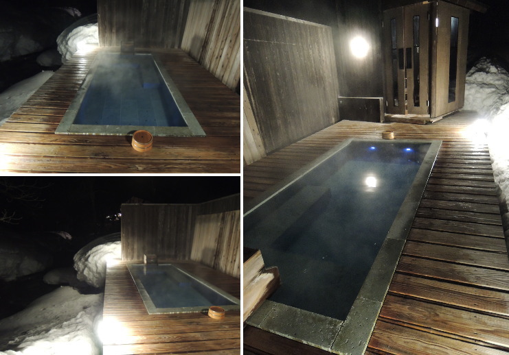 | 朝食時に猛烈に雪が降ってきたので露天風呂に入りたくなり、お願いしたら10時から貸りることができました。3回目の入浴は笠をかぶって(笑)。さすがにお湯の温度が下がり過ぎてて、かけ流し部分に張り付いてました(笑) |