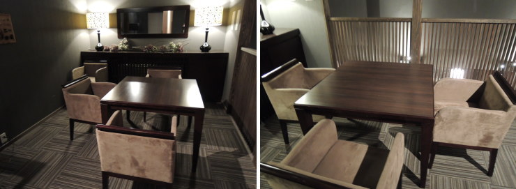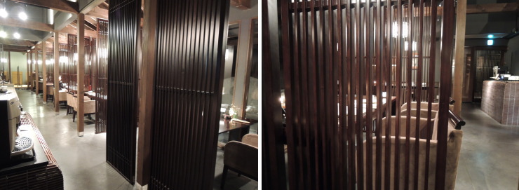 | ●食事処「福膳坊」。 夕食は19時からにしました。向かい合った席や中庭に向かって横並びの席など色々。隣りの席とは格子の仕切りがあるだけです。 |