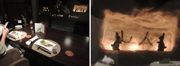 | 私たちの席はちょうど中央。正面に可愛い山人の文字(´ε`*)。これを作っていたんですね。しかし、食事処がかなり寒く、部屋から持参したひざ掛けがなかったら凍えていましたねー^^; |