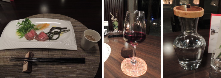 | 最初にテーブルに用意されていたのは「山人ビーフ」。ワインはリーズナブルな品揃え。夫がオーダーしたのは山人の料理と相性が抜群となっていた「農民ロッソ」。私は体調絶不調でお水のみ( ノД`) |