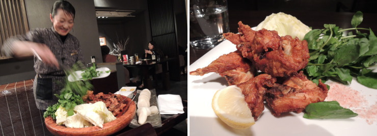 | 次にワゴンで提供されたのは「南部かしわの唐揚」。写真だとそれほど多く見えませんが、ケンタッキーフライドチキンサイズが3ピース、普通の唐揚サイズが2ピース、キャベツとクレソンの山盛りと凄いボリューム。これで私はすでに満腹、大食漢の夫も苦しそうに。ちょっと盛り過ぎでは?!(゚Д゚;) |