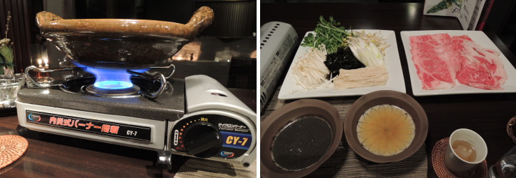 | すでに満腹だったんですが、予約時に別注してあった「岩手黒毛和牛と岩手短角牛の食べ比べ」が登場。少量のステーキか何かだと思っていたんですが、まさかの大量しゃぶしゃぶ。失敗したー |