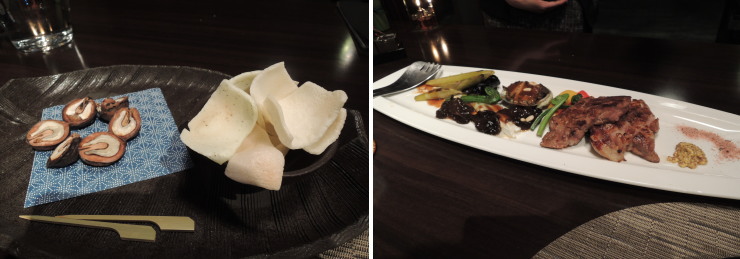 | 箸休めのクルミを無言でほじりながら、この後のメインに戦々恐々。で、倒れるかと思ったくらいの凄いボリュームのメインが登Σ(゚Д゚;)。 |