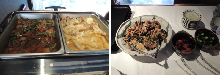 | メニューには「凍み大根の煮しめ」となっていましたが、巨大たくわんでした。好きなだけどうぞ、ということでしたが、1切れでもかなりの大きさ^^;。代わりに煮物はニシンと・・・なんとイルカ〜(´・ω・|||)。むっ、無理。。。 |