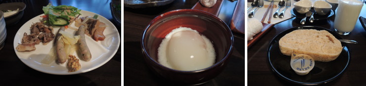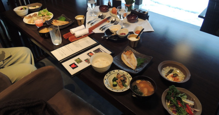| 朝食も同じテーブルで。すでにこのように素敵なセッティングが。卵は温泉卵。ハーフビュッフェとなっています。 |