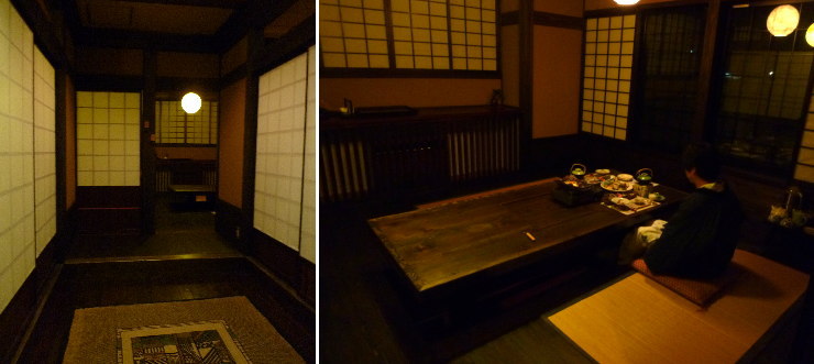 | ●食事処 夕食は6時から(決まってました)母屋の食事処で。準備ができ次第、客室に電話が入ります。複数テーブルのある広間や囲炉裏の間もあるようですが、今回は事前に個室をお願いしておきました。通されたのは2人では勿体無いくらい広く高級感のある個室♪ |