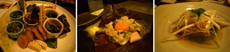 | 前菜の大皿には郷土料理がたくさん♪実はどれもちょっと苦手な味なのですが、奥飛騨っぽくて目では楽しめます(笑)。初めて食べた「漬物のステーキ(バターと卵黄と味噌焼き)」は美味しかったなー♪ |