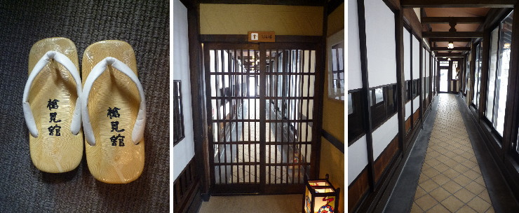 | チェックイン後の館内はネーム入りの草履で移動します。大浴場と離れは宿の端と端に位置しているので遠いですが、いい運動にもなります(笑) |