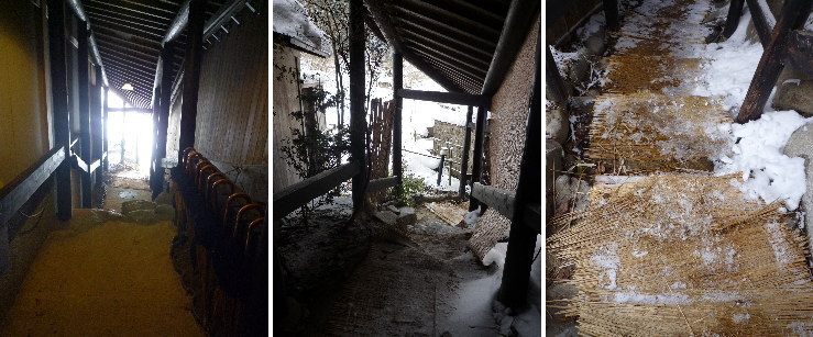 | 滑り止めの藁が敷かれた階段を下ります。途中風が吹くとこんな感じの過酷な状況に(笑)。雪をかぶりながらの温泉巡りです(笑)。 |