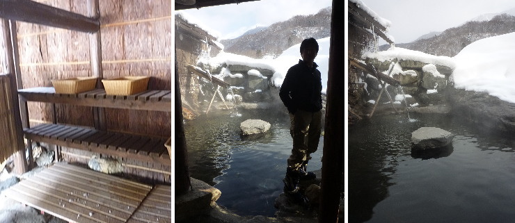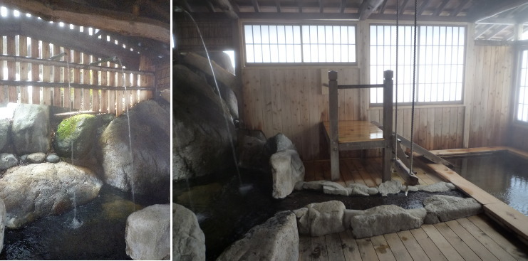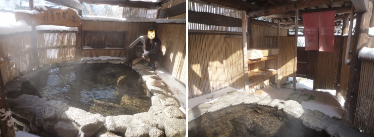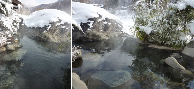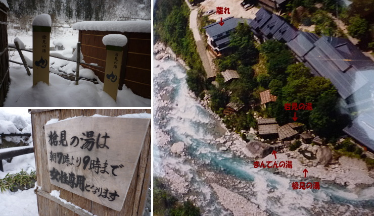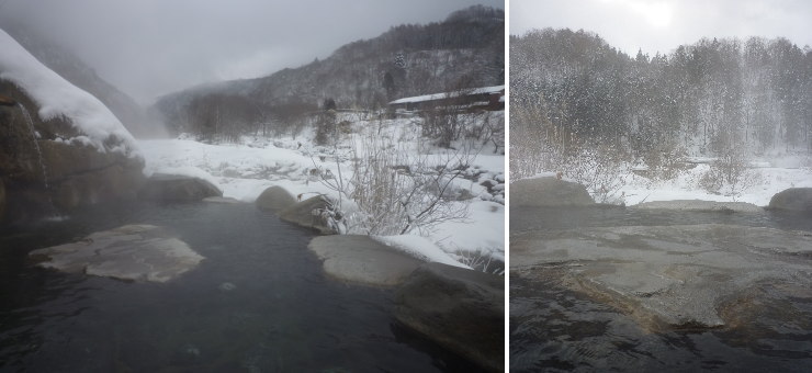 | こちらは男性用出入り口から見たお風呂。左下写真が女性用出入り口から続く通路です。こちら側の方が少し景色が開けているので開放感があります。何となく男女が別れているので、混浴でも「槍見の湯」よりは入りやすいでしょうか。私は混浴などこっぱずかしくて絶対無理なので入りませんでしたが(笑) |