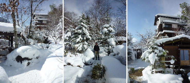 | 川沿いの貸切風呂ゾーンはこんな感じの雪の世界。左右に貸切風呂が点在しています。見上げると近くて遠い離れのお部屋(笑) |